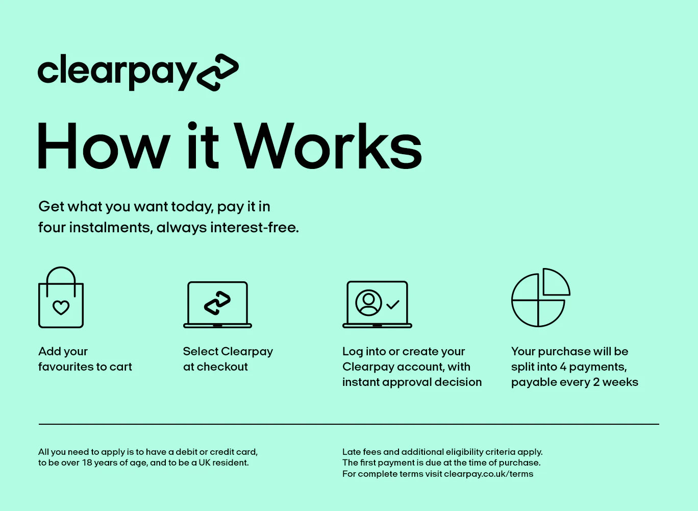 Please note, all items in your shopping bag must be eligible for Clearpay and the shopping value must be under *£1000. We currently only offer Clearpay on orders over £30 in value, to customers based in the UK.