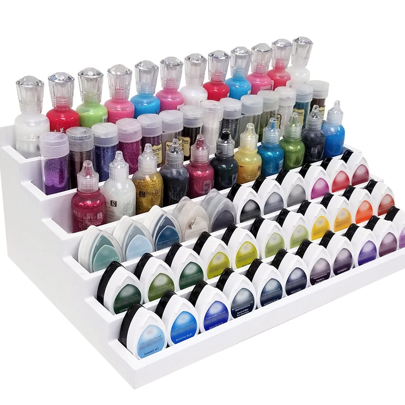 Glitter Glue storage in plain sight! Make your glitter glue easy to access when crafting at home. Stickles Glitter Glues, Re-inker bottles: 14 bottles per row, 84 bottles total. Also holds larger Nuvo Drops & Studio G bottles.