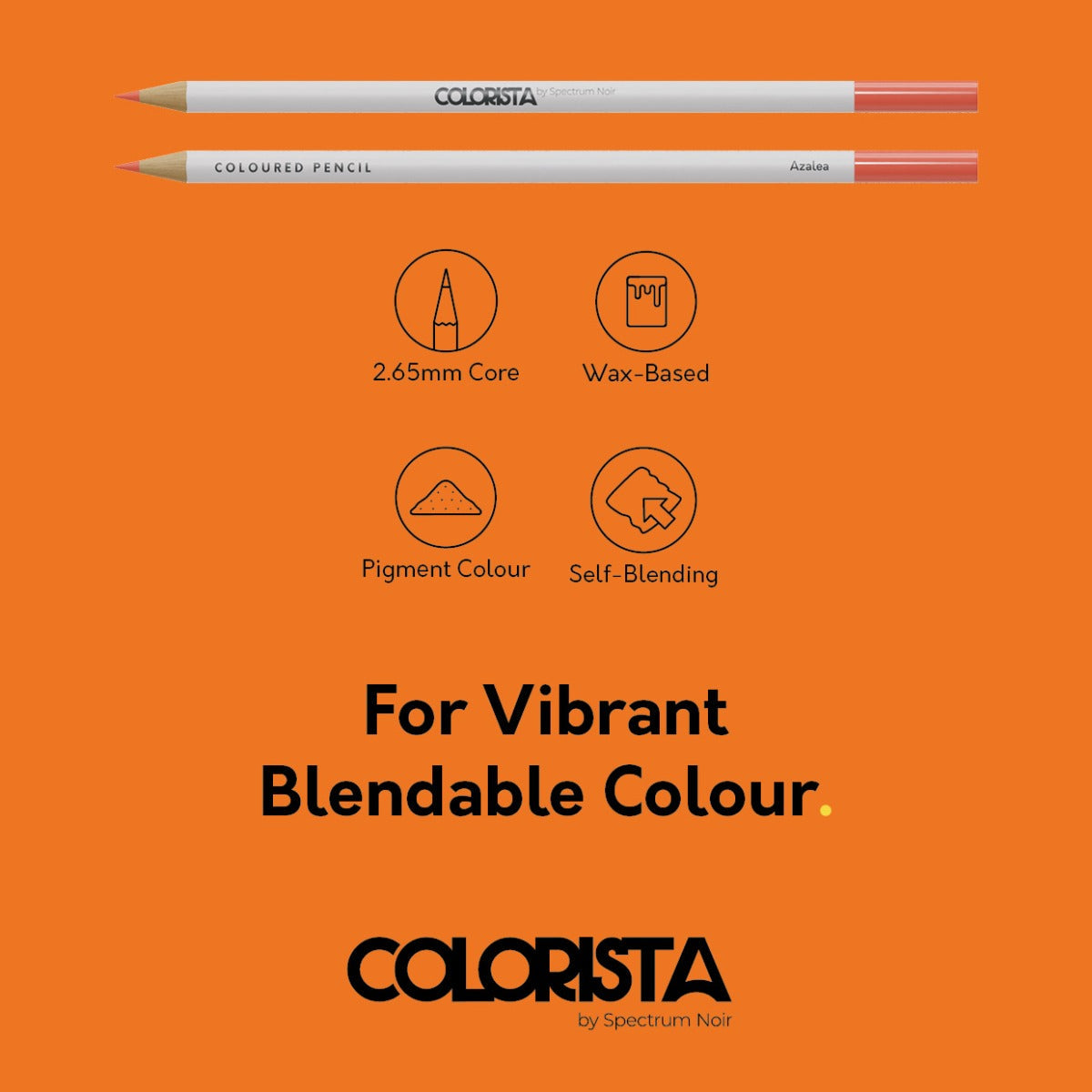 Now for the technical bit. Each pencil holds a core of high quality wax-based pigment. This premium formulation offers a bold and vivid laydown of colour every time you put pencil to paper. The wax-based pigment also allows you to layer and blend colours with ease!