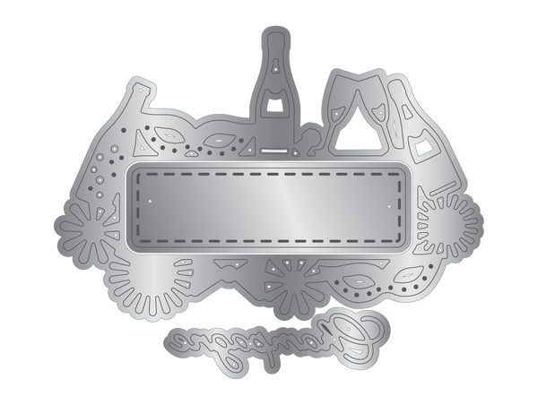 Three dies to cut out a label with stitched edge detail, a matching frame edged with champagne bottles, glasses and party decorations and a ‘Champagne’ message sized to sit inside.