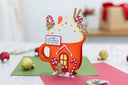 - 22-piece stamp and die set to create a shaped card base of a loaded hot chocolate home for a gingerbread man as a card base.
