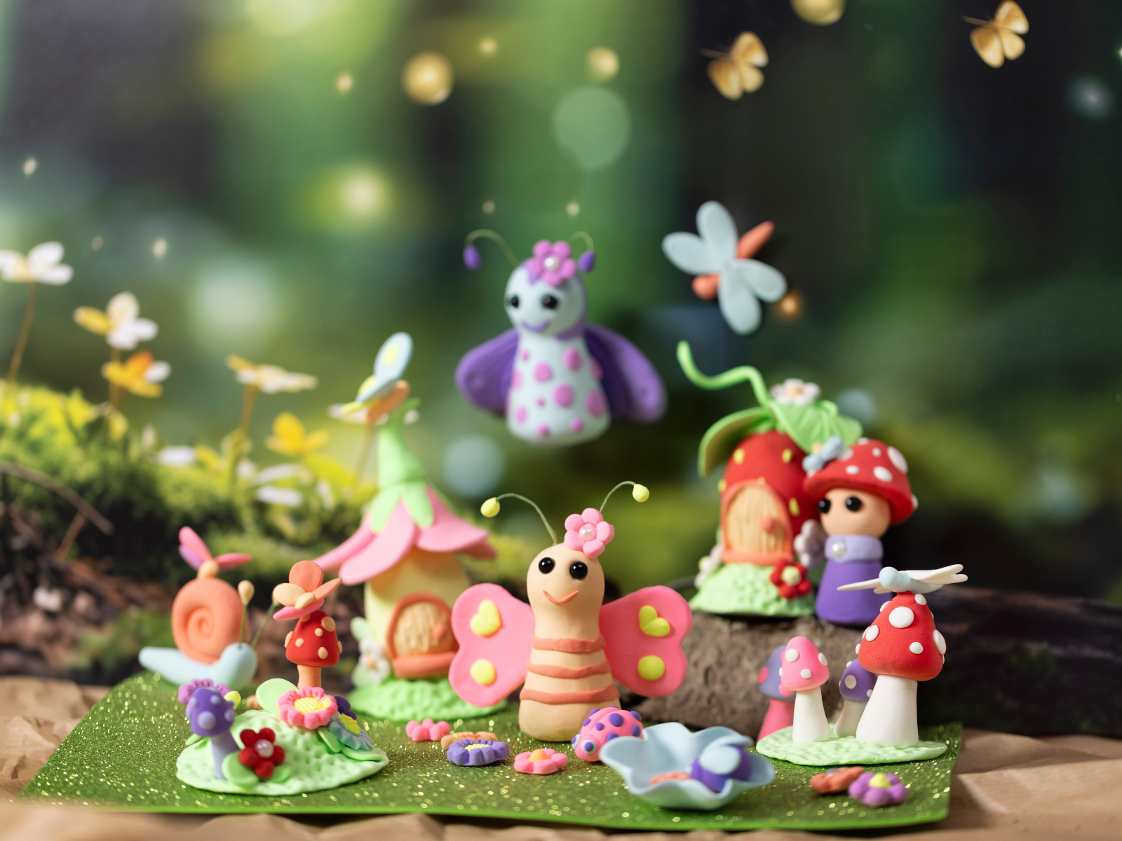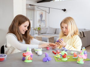 Do you have children who love fairytales? This Craft Kit is just what they need. Create an entire fairytale universe out of Silk Clay® together. Build enchanting little fairy houses and make magical forest friends like snails, butterflies and mushrooms. Everything is moulded out of soft and flexible Silk Clay® – including the flowers. Simply use the flower mould that comes with the kit to make the process extremely easy. Finally, place the entire universe on the glittery green EVA foam forest floor.