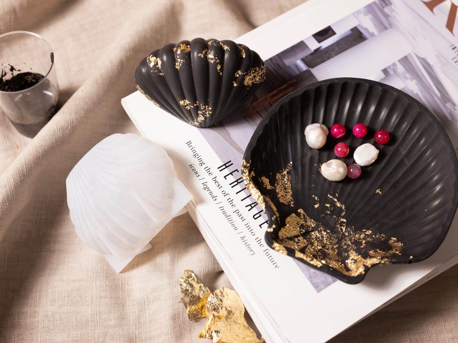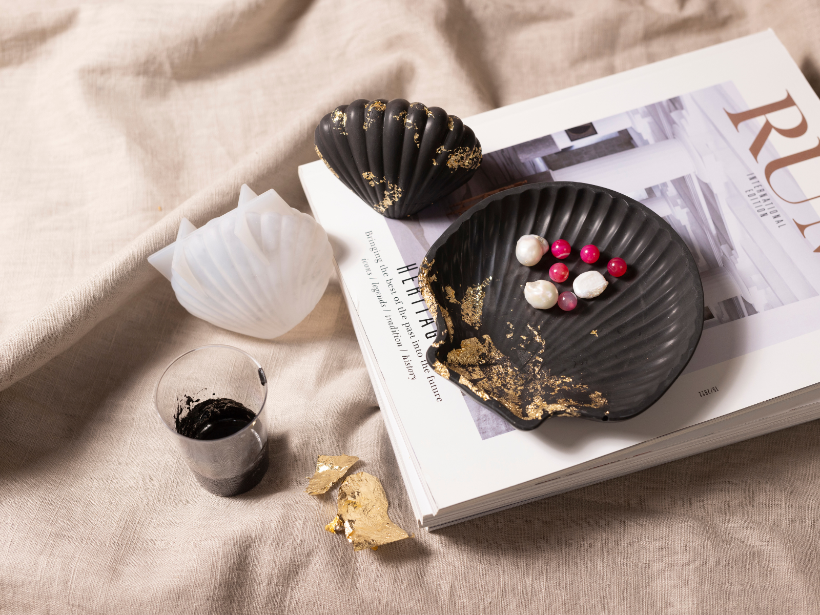 If you dream of making your own home decor, this box is perfect for you. Using black resin cast, this box allows you to make two pieces for your home – a lovely, small mussel sculpture and a beautiful, decorative mussel bowl. The casting process is simple and straightforward. Simply mix the casting powder with water. Then add some gold leaf to the mould before pouring the water mixture into the mould. The results are impressive. The black colour becomes deep and intense – almost like a ceramic finish – and the gold leaf adds a touch of luxury. We recommend using the gloves provided, as the colour has a high pigmentation. Also remember to cover the area where you are casting to avoid spills and stains .